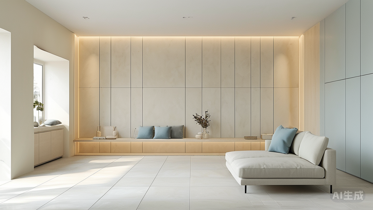 第三幕:色彩的共谋 浅色柔光砖绝非孤军奋战。当它与同样轻盈的墙面色彩(奶油白、浅灰蓝、淡燕麦色)形成柔和的明度过渡,空间便被包裹进一个没有压迫感的浅色系"光盒子"里。此时若搭配细腿家具、悬空柜体,进一步释放地面面积,整个空间便呈现出不可思议的通透感。即使是在厨房或卫生间这类功能区,延续浅色柔光砖也能避免因铺贴不同材质而产生的视觉中断,让整体空间叙事更流畅统一。