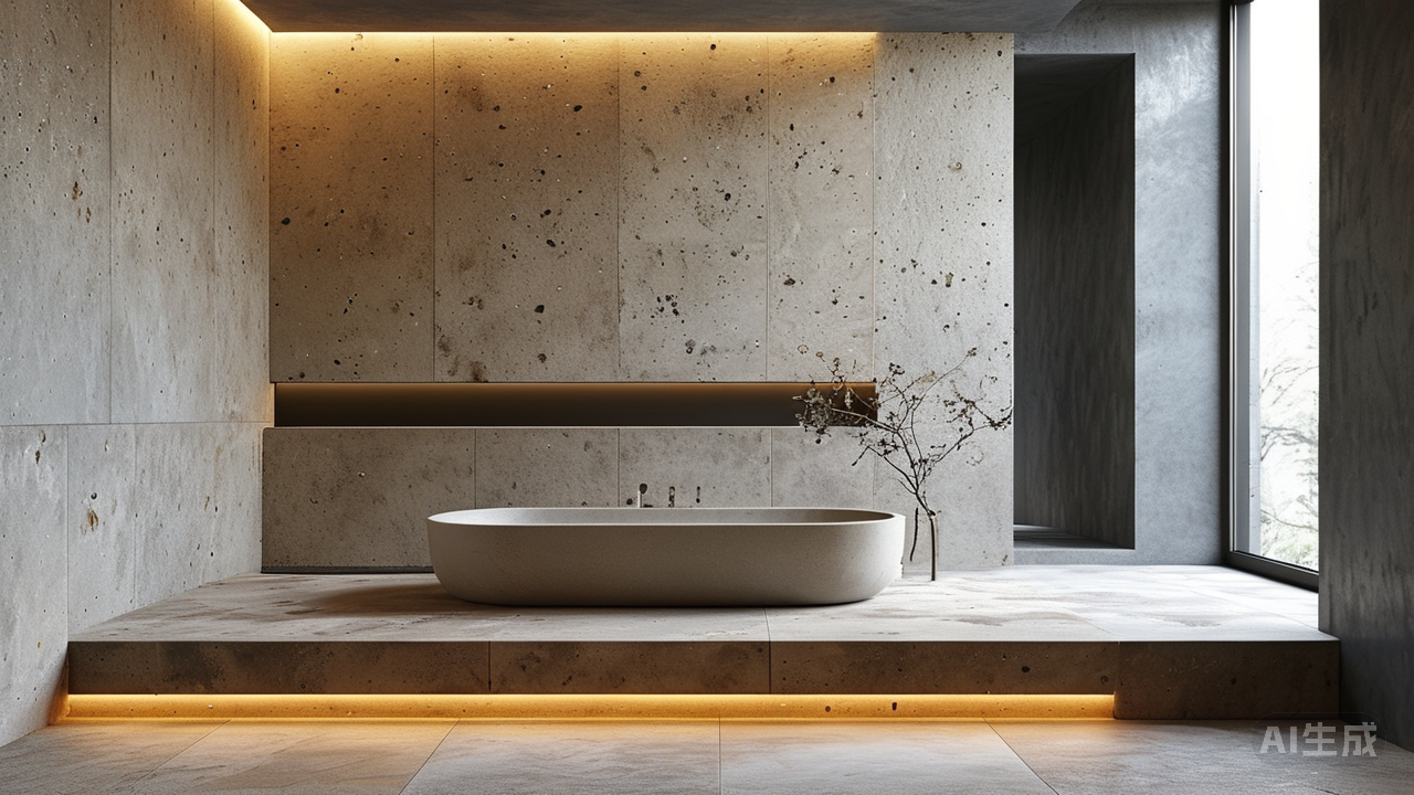 工业优雅: 深灰混凝土肌理超防滑砖通铺地面,部分墙面呼应,搭配黑色金属框架、简约洁具,演绎冷静克制的工业美学。适用: LOFT风格、追求个性与实用性。