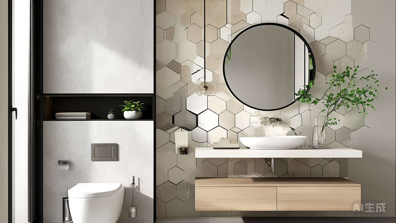 摩登几何玩家: 地面大胆铺贴黑白灰六边形超防滑砖,墙面辅以纯色哑光砖,几何线条碰撞现代金属卫浴,瞬间提升空间艺术感与活力。适用: 年轻家庭、钟爱现代设计感。
